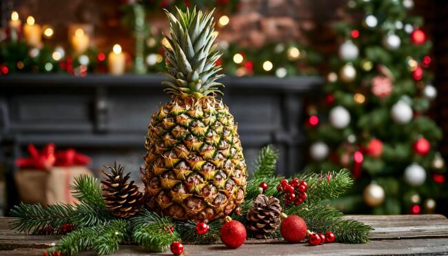 Вокруг разложите кусочки ананаса, свежие фрукты или ягоды. Они не только украсят блюдо, но и поддержат елочку, делая ее устойчивой.